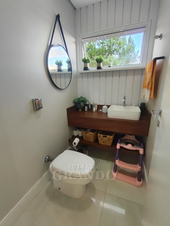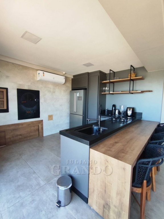 A cozinha é funcional e elegante, com área de serviço ventilada e discretamente escondida, mantendo a casa sempre organizada.